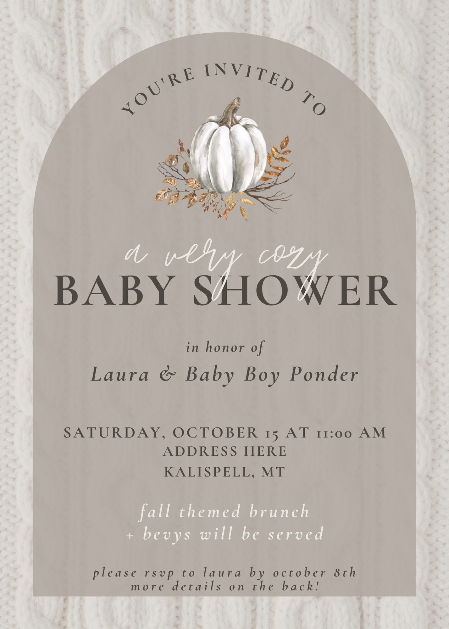 Below you’ll see the invites, pictures from the shower, the menus for food and drink, and some fun details about how I pulled it off. If you’re ever looking to host a cozy themed shower, at least this might provide you with a little bit of the inspiration I was never able to track down: