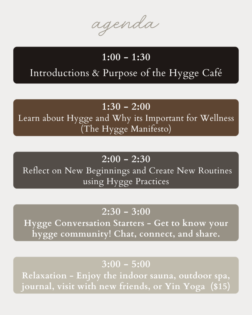 • Engaging and meaningful conversations around life, wellness, and hygge.